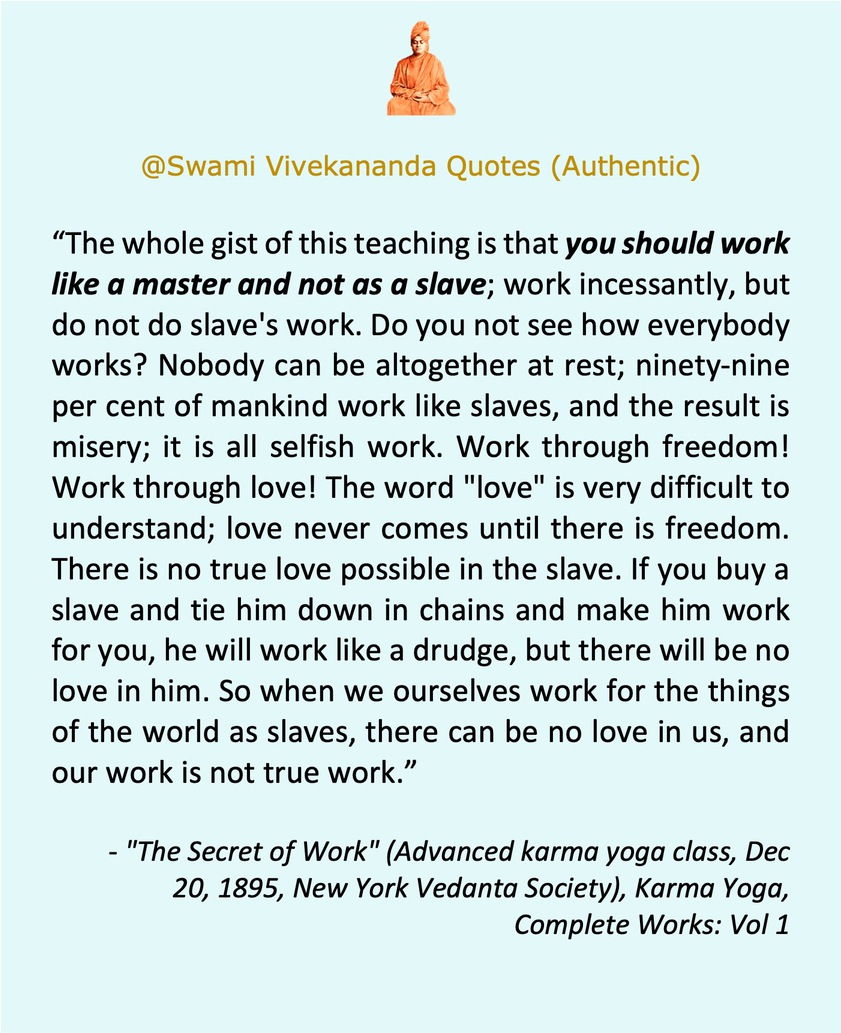 "The whole gist of this teaching is that you should work like a master and not as a slave; work incessantly, but do not do slave's work. Do you not see how everybody works? Nobody can be altogether at rest; ninety-nine per cent of mankind work like slaves, and the result is misery; it is all selfish work. Work through freedom! Work through love! The word "love" is very difficult to understand; love never comes until there is freedom. There is no true love possible in the slave. If you buy a slave and tie him down in chains and make him work for you, he will work like a drudge, but there will be no love in him. So when we ourselves work for the things of the world as slaves, there can be no love in us, and our work is not true work."
