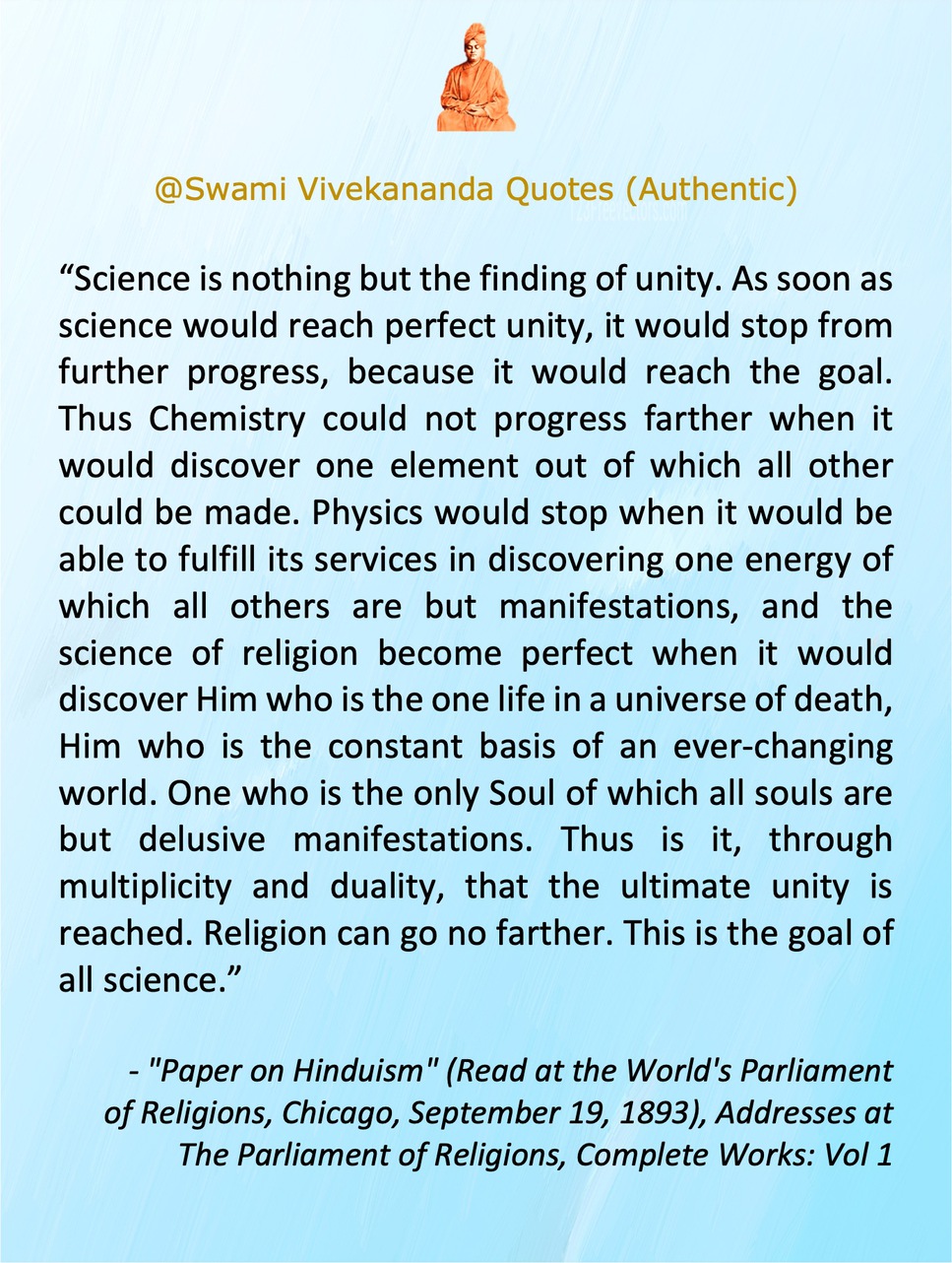 "Science is nothing but the finding of unity. As soon as science would reach perfect unity, it would stop from further progress, because it would reach the goal. Thus Chemistry could not progress farther when it would discover one element out of which all other could be made. Physics would stop when it would be able to fulfill its services in discovering one energy of which all others are but manifestations, and the science of religion become perfect when it would discover Him who is the one life in a universe of death, Him who is the constant basis of an ever-changing world. One who is the only Soul of which all souls are but delusive manifestations. Thus is it, through multiplicity and duality, that the ultimate unity is reached. Religion can go no farther. This is the goal of all science."